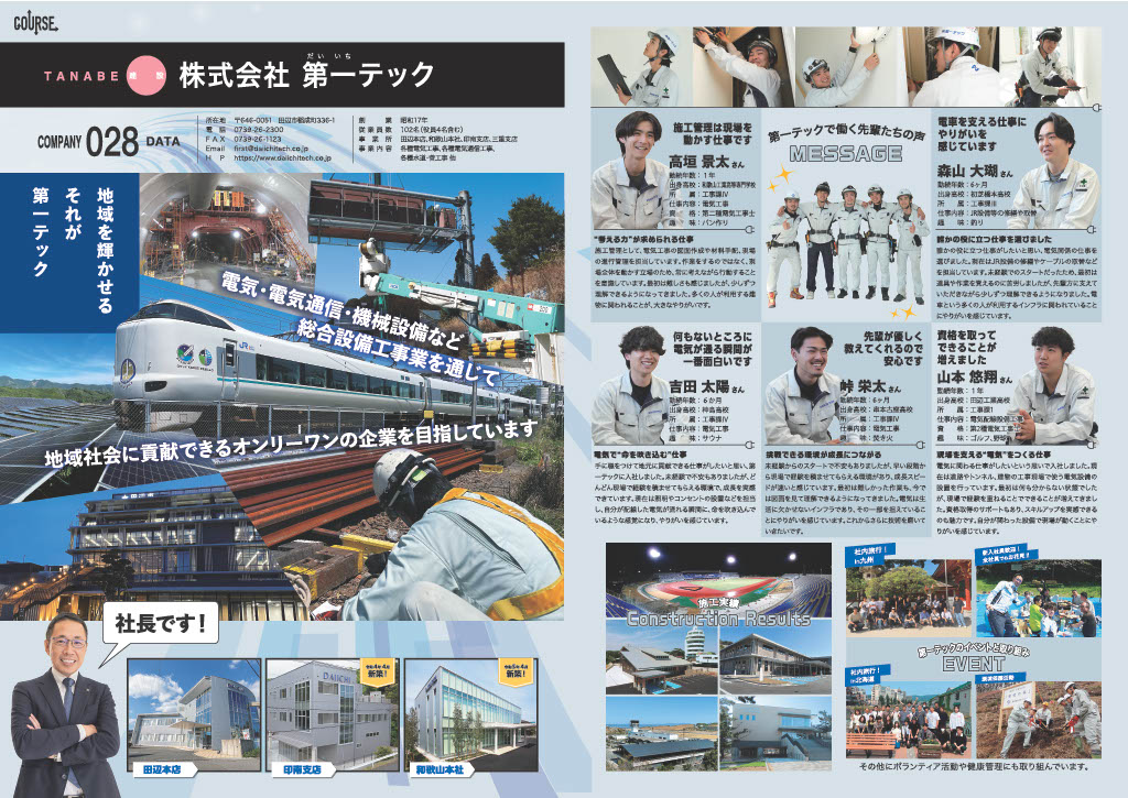 和歌山県経営者協会主催、インタ-ンシップ制度に加盟しています。 大学院・大学・高等専門学校・技術専門学校・高等学校等の学生の会社訪問・作業現場の見学等を実施しています。 総務課 宛にお申込み下さい。℡.0739-26-2300 mail:first@daiichitech.co.jp