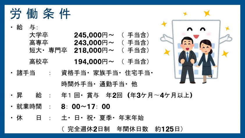 | 採用データ | ●給 与 大学卒/245,000円~(手当含む) 高専卒/243,000円~(手当含む) 短大・専門学校卒/218,000円~(手当含む) 高校卒/194,000円~(手当含む) ●諸手当 時間外手当 家族手当 通勤交通手当 資格手当 他 ●昇 格 年1回 ●賞 与 年2回 |